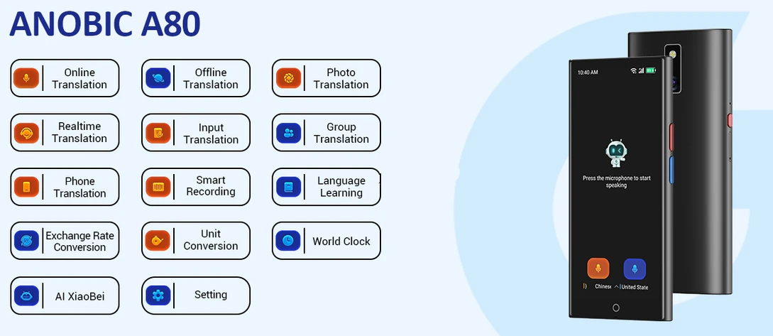 Anobic AI A80 je navržen tak, aby byl co nejvíce uživatelsky přívětivý. Jeho intuitivní ovládání umožňuje rychlé a bezproblémové používání, i pokud nejste technický odborník. Kompaktní design překladače navíc zajišťuje, že jej snadno přenesete v kapse nebo tašce, ať už cestujete kamkoliv.