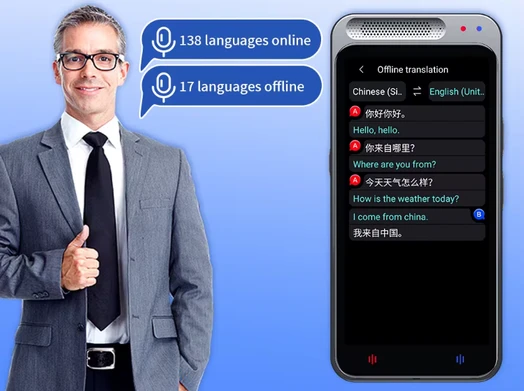 Offline překlad a inteligentní nahrávání: Náš hlasový překladač podporuje offline jazykový překlad pro 17 zemí. Můžete si předem stáhnout offline jazykový balíček podle svých osobních potřeb. Hlasový překladač podporuje také inteligentní nahrávání s pokročilou redukcí šumu ze dvou mikrofonů a snímací vzdáleností až 6,5 stopy. Jedná se o nahrávací nástroj pro návštěvy a účast na jednáních, přednáškách nebo projevech.
